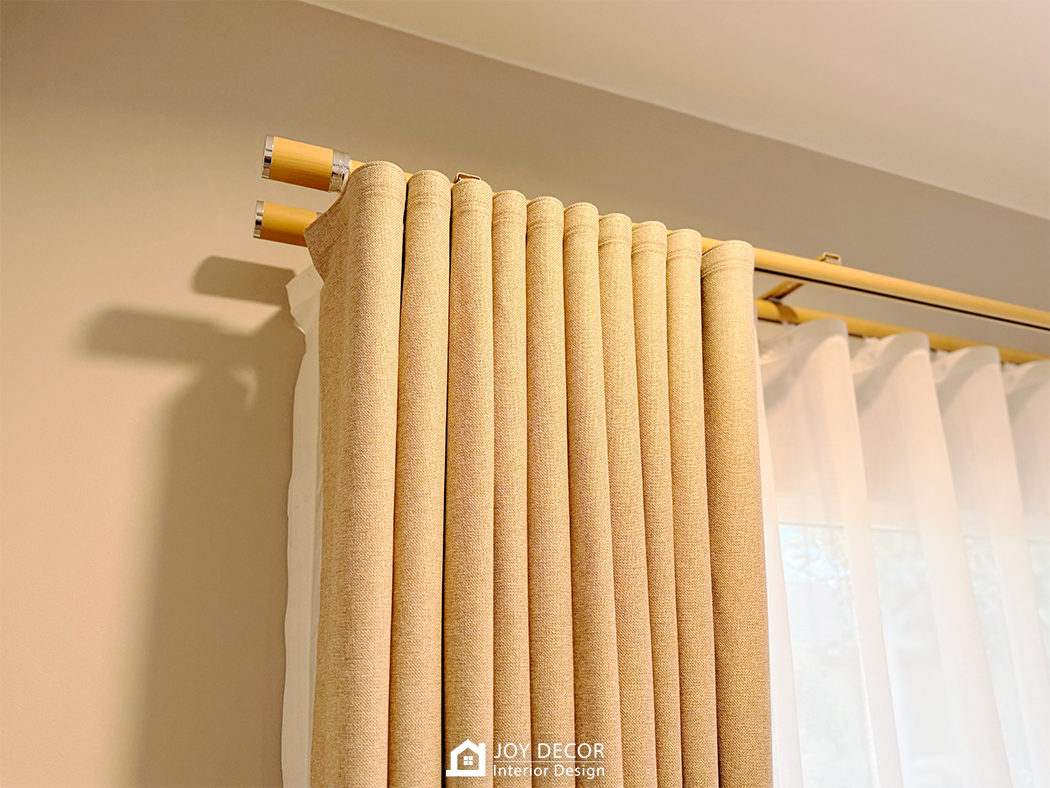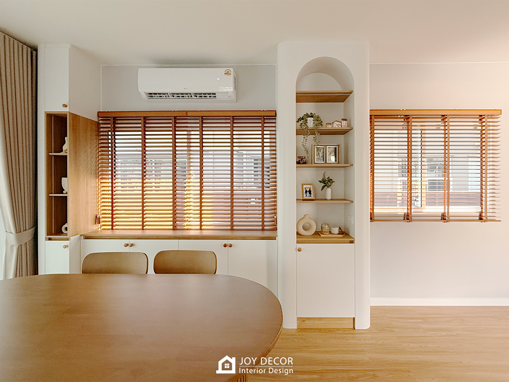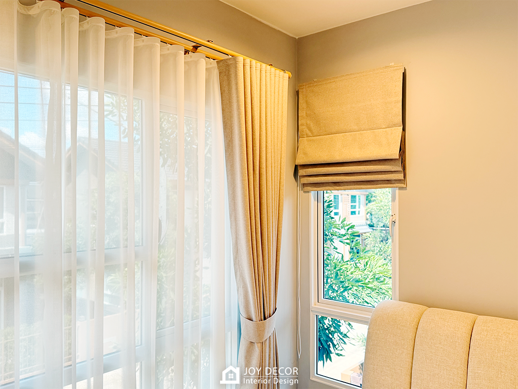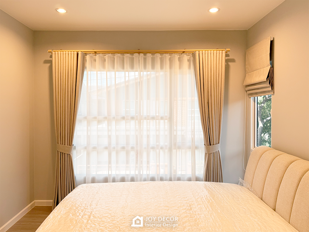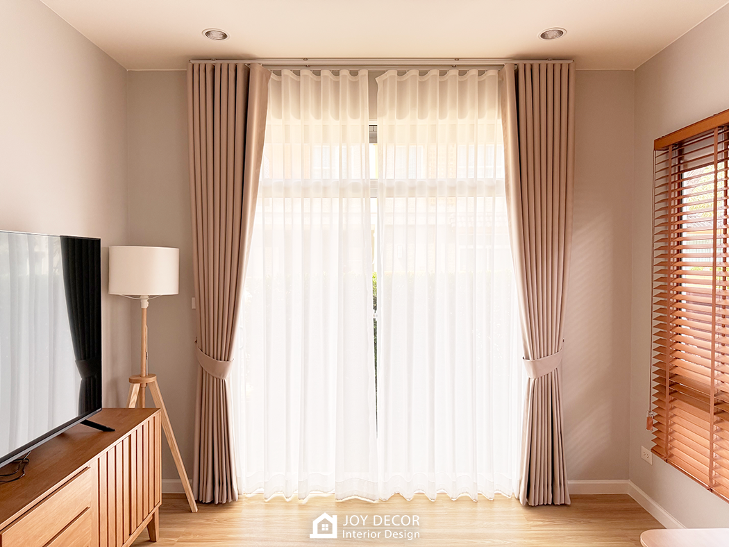 อบอุ่น นุ่มนวล สไตล์มินิมอล... ห้องรับแขกติดตั้งผ้าม่านลอนเทปด้วยผ้าดิมเอาท์สองชั้นผ้าทึบและผ้าโปร่งที่ช่วยให้บรรยากาศในบ้านนุ่มนวลมากขึ้น โดยเลือกผ้าสีครีมให้เข้ากับสีของบิ้วอิน สีของเฟอร์นิเจอร์และสีของพื้น ผสมกับการใช้มู่ลี่ในบางจุดที่มีจุดเด่นในเรื่องของการปรับแสง ร่วมถึงเพิ่มความเป็นธรรมชาติให้กับพื้นที่อีกด้วย รวมถึงมีการวางแผนบิ้วอินไว้ล่วงหน้าให้ไม่กระทบกับการติดผ้าม่านและมู่ลี่อีกด้วย