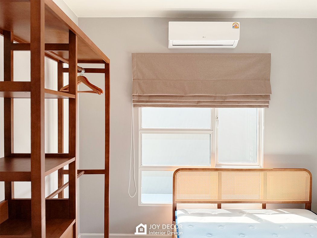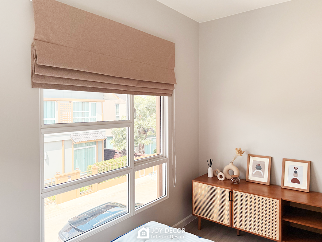 ห้องนอนเพิ่มความ Muji ด้วยรางโชว์ลายไม้สีเมเปิ้ล เลือกใช้ผ้า blackout ที่มี texture แบบลินิน ผสมกับการใช้ม่านพับ และมู่ลี่ รวมถึงสีที่เลือกใช้ องค์ประกอบเหล่านี้ทั้งหมดเสริมให้สไตล์มินิมอลดูชัดเจนมากขึ้น
