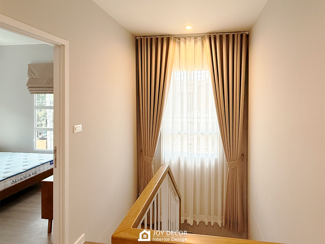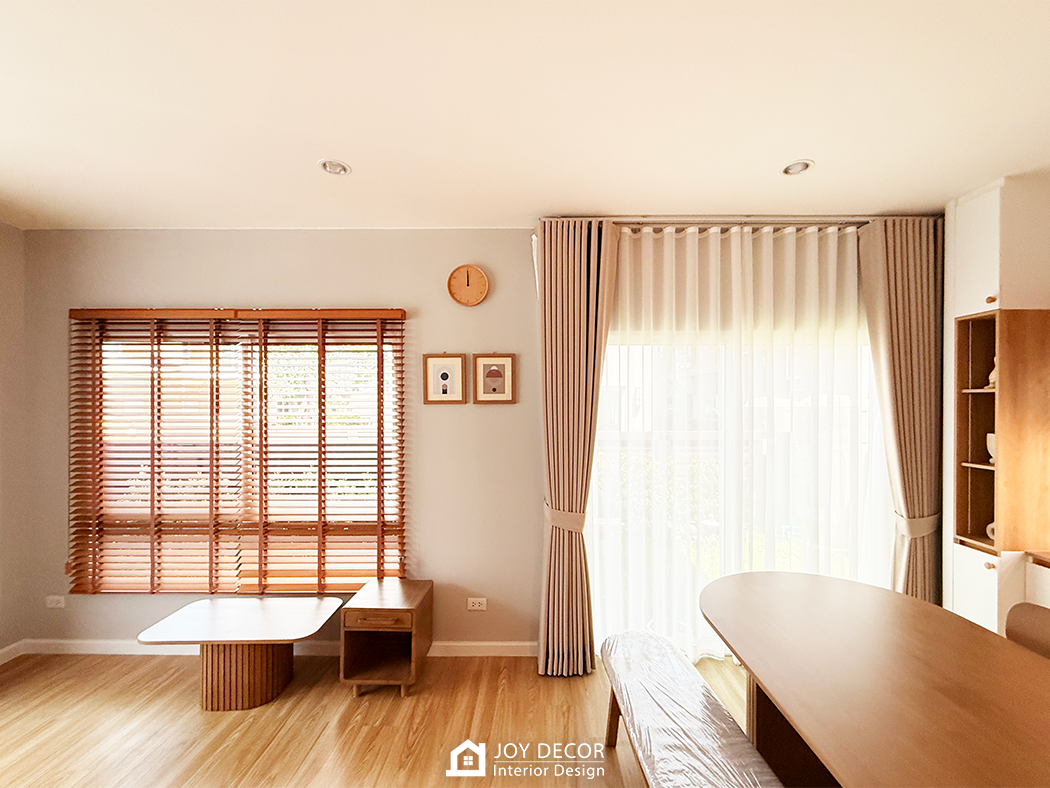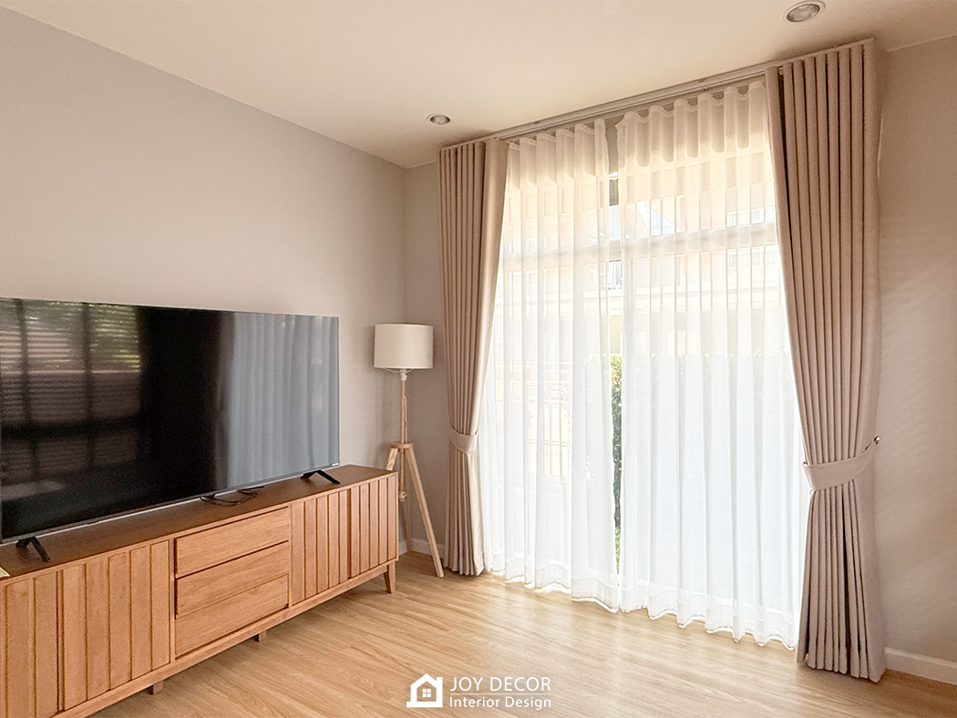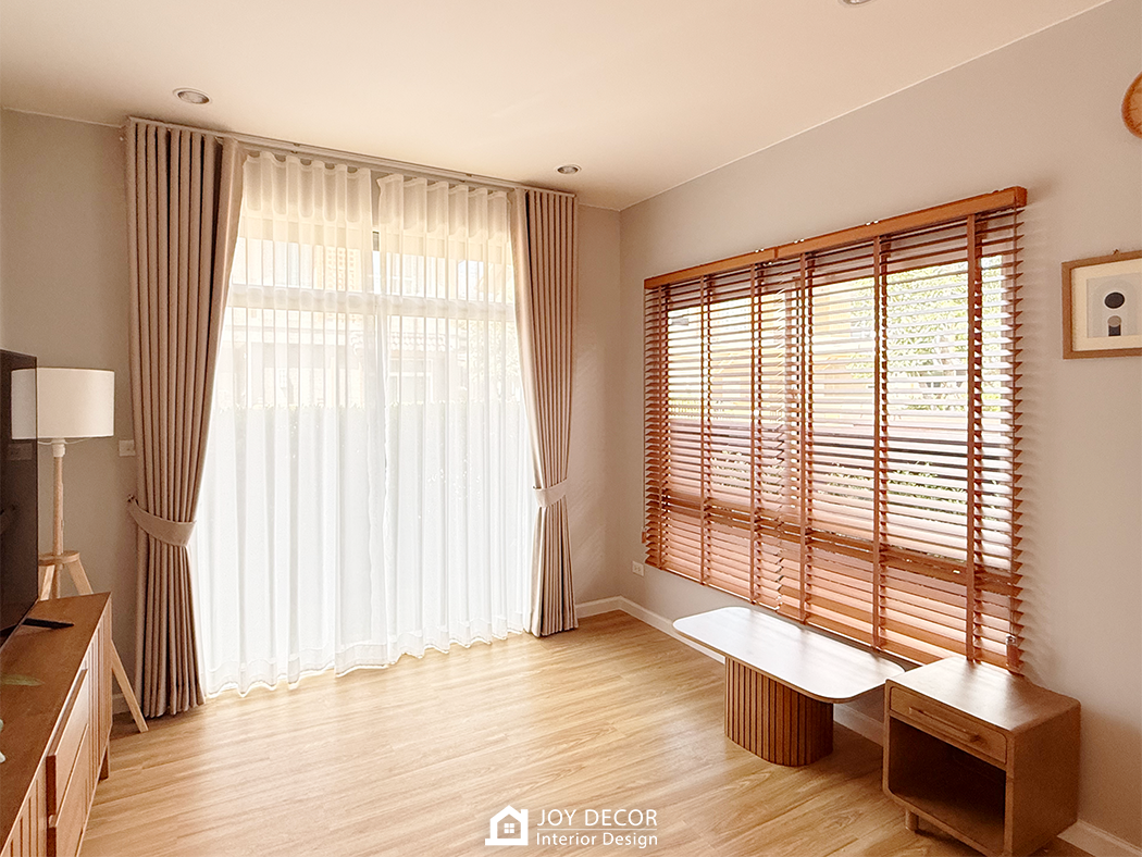อบอุ่น นุ่มนวล สไตล์มินิมอล... ห้องรับแขกติดตั้งผ้าม่านลอนเทปด้วยผ้าดิมเอาท์สองชั้นผ้าทึบและผ้าโปร่งที่ช่วยให้บรรยากาศในบ้านนุ่มนวลมากขึ้น โดยเลือกผ้าสีครีมให้เข้ากับสีของบิ้วอิน สีของเฟอร์นิเจอร์และสีของพื้น ผสมกับการใช้มู่ลี่ในบางจุดที่มีจุดเด่นในเรื่องของการปรับแสง ร่วมถึงเพิ่มความเป็นธรรมชาติให้กับพื้นที่อีกด้วย รวมถึงมีการวางแผนบิ้วอินไว้ล่วงหน้าให้ไม่กระทบกับการติดผ้าม่านและมู่ลี่อีกด้วย