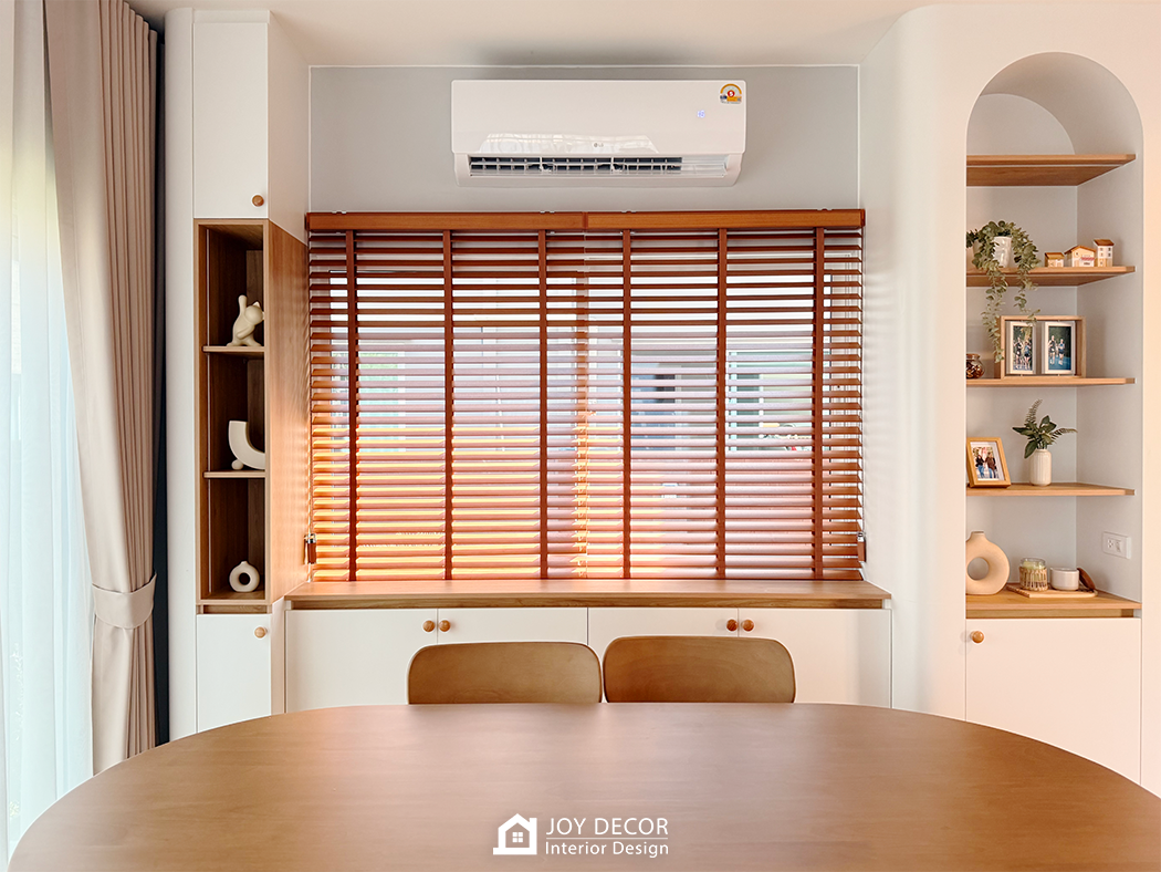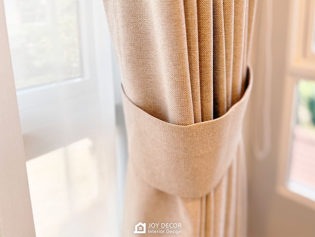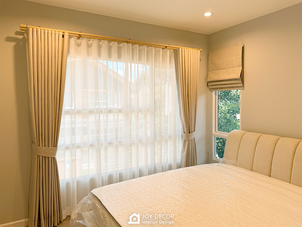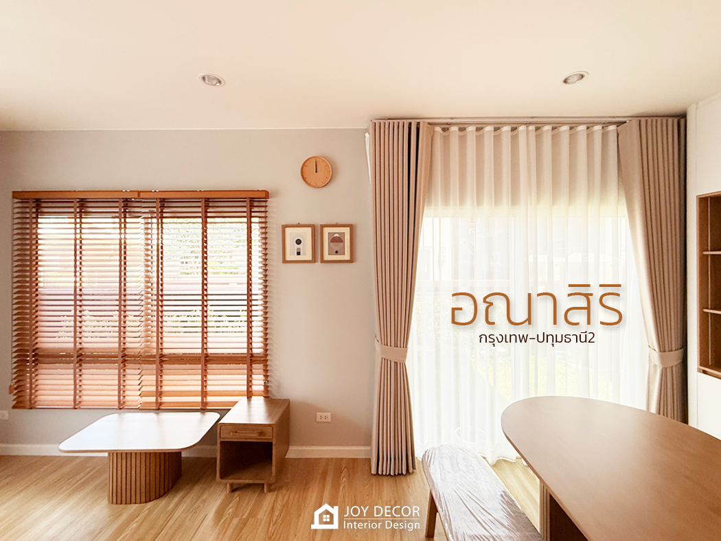 อบอุ่น นุ่มนวล สไตล์มินิมอล... ห้องรับแขกติดตั้งผ้าม่านลอนเทปด้วยผ้าดิมเอาท์สองชั้นผ้าทึบและผ้าโปร่งที่ช่วยให้บรรยากาศในบ้านนุ่มนวลมากขึ้น โดยเลือกผ้าสีครีมให้เข้ากับสีของบิ้วอิน สีของเฟอร์นิเจอร์และสีของพื้น ผสมกับการใช้มู่ลี่ในบางจุดที่มีจุดเด่นในเรื่องของการปรับแสง ร่วมถึงเพิ่มความเป็นธรรมชาติให้กับพื้นที่อีกด้วย รวมถึงมีการวางแผนบิ้วอินไว้ล่วงหน้าให้ไม่กระทบกับการติดผ้าม่านและมู่ลี่อีกด้วย