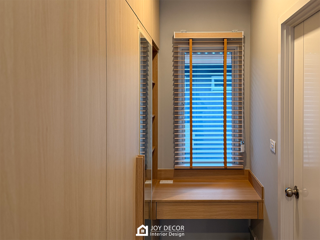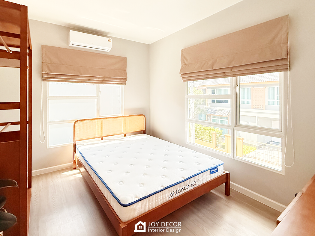 ห้องนอนเพิ่มความ Muji ด้วยรางโชว์ลายไม้สีเมเปิ้ล เลือกใช้ผ้า blackout ที่มี texture แบบลินิน ผสมกับการใช้ม่านพับ และมู่ลี่ รวมถึงสีที่เลือกใช้ องค์ประกอบเหล่านี้ทั้งหมดเสริมให้สไตล์มินิมอลดูชัดเจนมากขึ้น